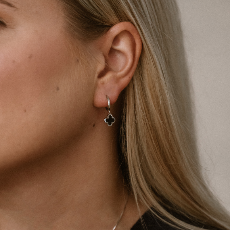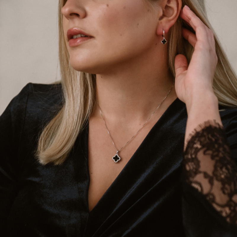 De oorbellen klaver Onyx zilver wordt geleverd in een sieradendoosje van Petit Comité.