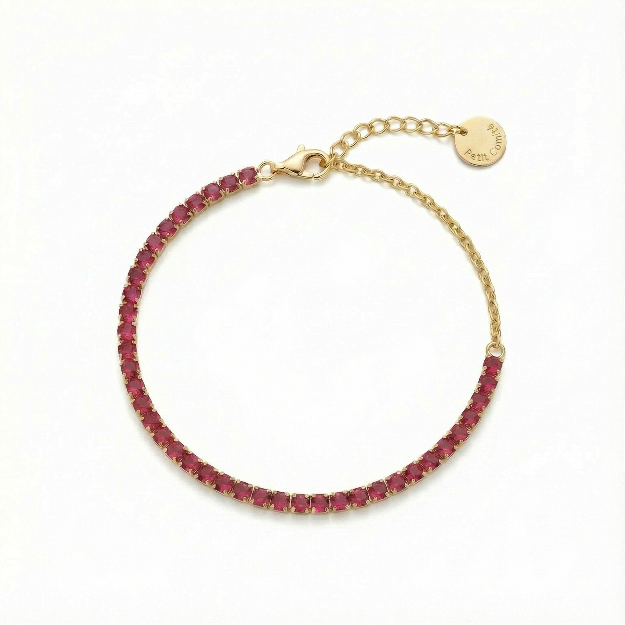 De granaat tennis bracelet geboorte steen juli worden geleverd in een sieradendoosje van Petit Comité.